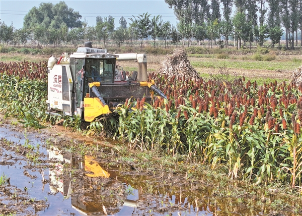 平遙縣寧固鎮(zhèn)豐依村農(nóng)機(jī)手駕駛履帶式收割機(jī)搶收高粱,確保應(yīng)收盡收,顆粒歸倉(cāng)。 本報(bào)通訊員 梁生仁 攝