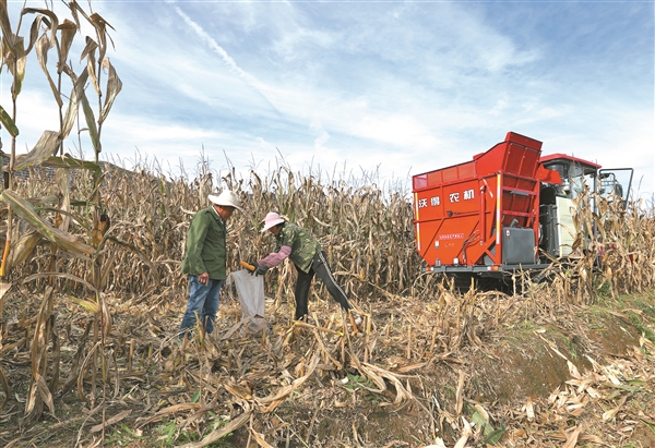 昔陽(yáng)縣趙壁鄉(xiāng)東平原村村民搶抓有利天氣,搶收玉米。 本報(bào)記者 裴曉軍 攝