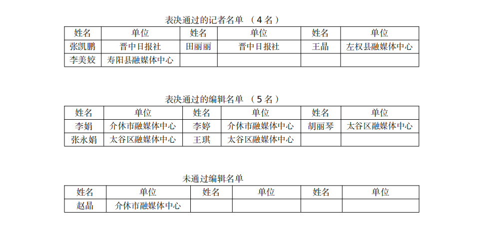 經(jīng)晉中市新聞系列中級職稱評審委員會2025年10月19日評審,全體評審委員表決通過了張凱鵬等9名編輯(記者)的專業(yè)技術(shù)職務任職資格?,F(xiàn)予以公示,歡迎社會各界監(jiān)督。如有異議,請于公示之日起5個工作日內(nèi)向晉中市人社局專管科、晉中市委宣傳部新聞科反映。