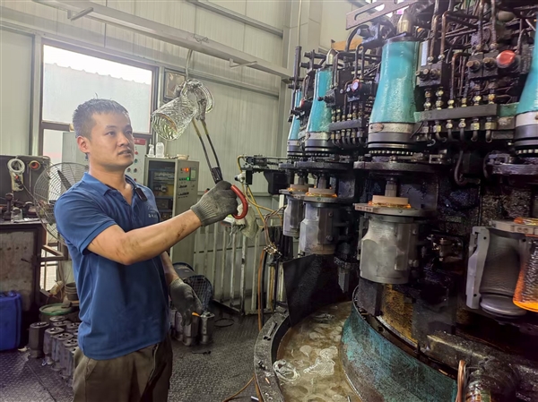 過去,祁縣人工吹制玻璃,工人要圍在1000℃左右的坩堝爐前,手持1.5米空心鐵管挑液、滾勻、吹氣、轉動成型,一個杯子用時幾十秒甚至更久。師傅們既要技術高超,又得穿厚重的防護服在高溫下作業(yè),非常辛苦,且產品易有氣泡、水波紋等瑕疵。